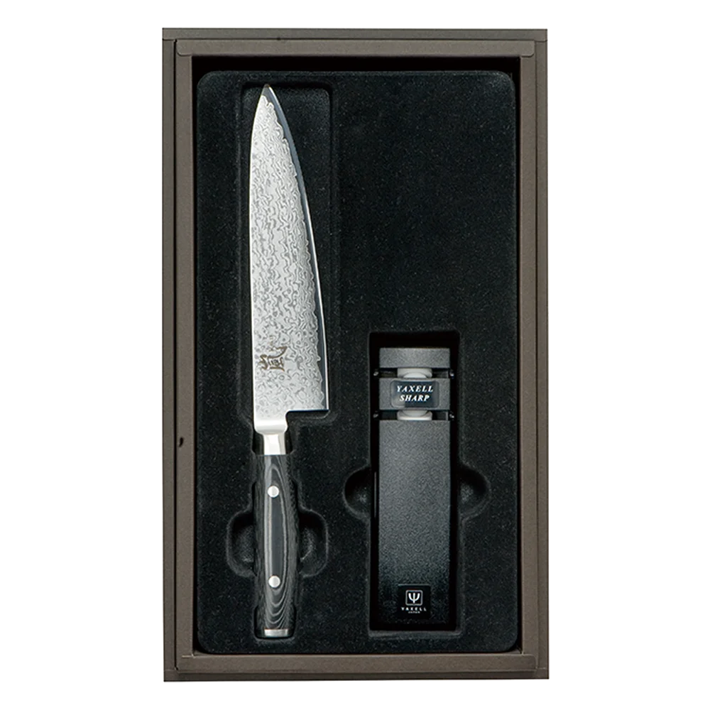 Заточка леза. Заточувати лезо ножів з дамаської сталі потрібно спеціальним точилом Yaxell або водним точильним каменем Yaxell. Універсальним є камінь із зернистістю 1000/3000. Частота заточки залежить від інтенсивності використання ножа і проводиться по мірі необхідності.