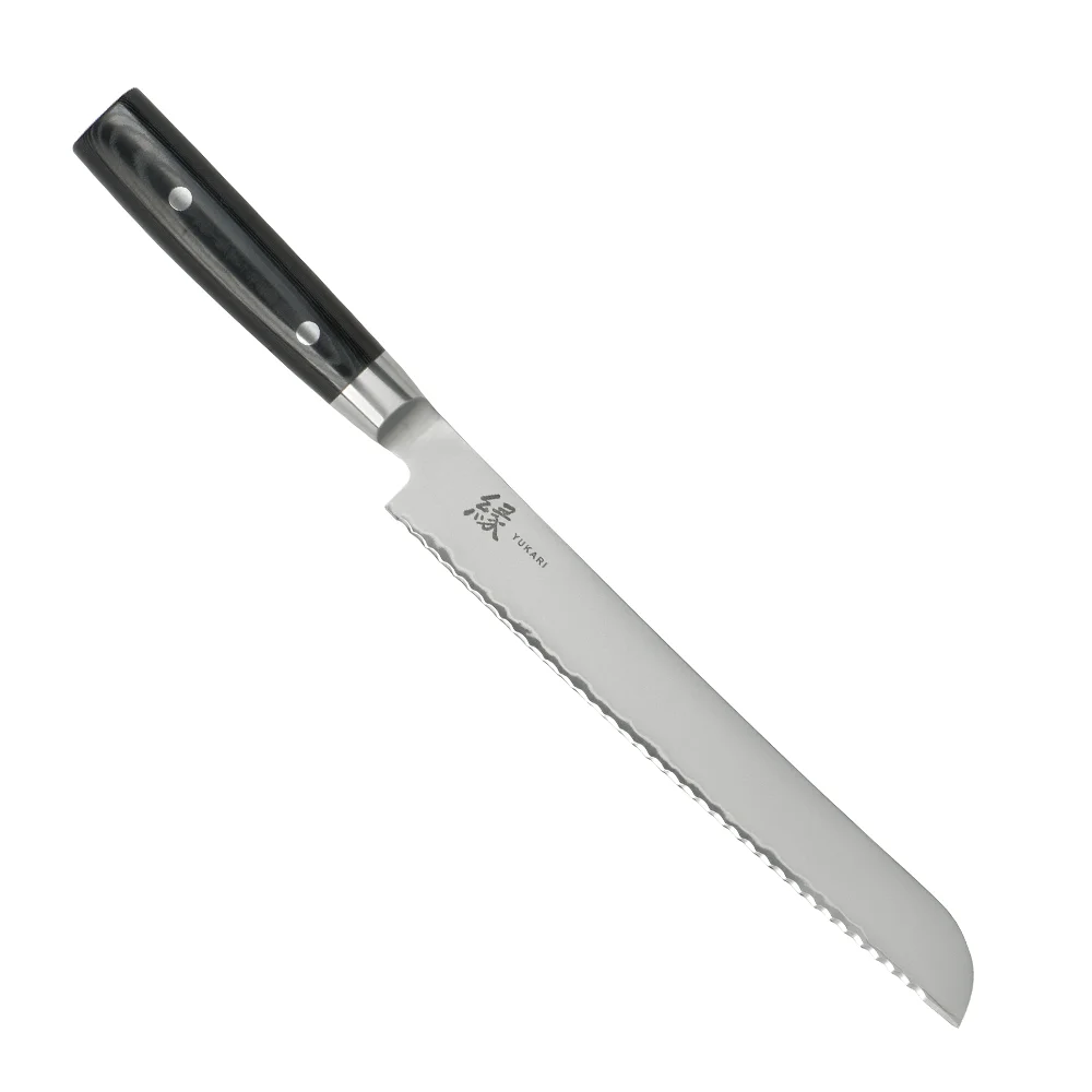 Японський ніж серії YUKARI з серрейторним лезом із дамаської сталі 23 см підходить для щоденного використання на професійній або домашній кухні, оскільки витримує будь-яке робоче навантаження. Використовується як ніж для хліба, ніж для торта, кондитерський ніж і т.п. Пилоподібна форма ріжучої кромки серрейторного ножа дозволяє делікатно розрізати м’якоть і скоринку хліба або виробів з тіста.