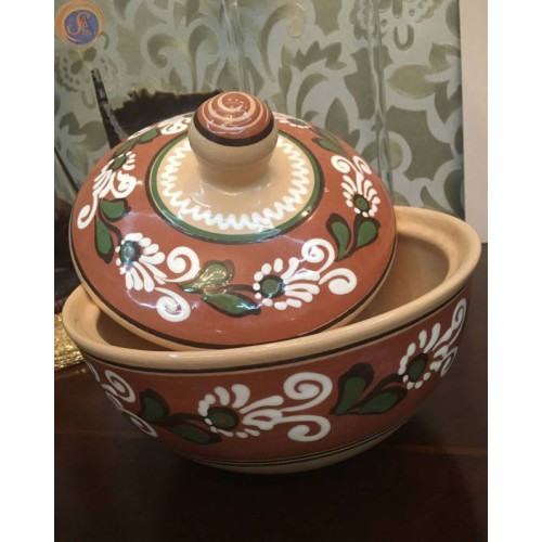 Розписна велика миска з кришкою для вареників в українському стилі.