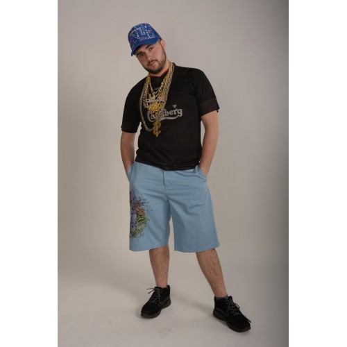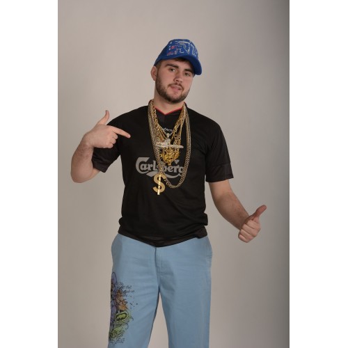 1. Репер: футболка, шорты, кепка, цепи;